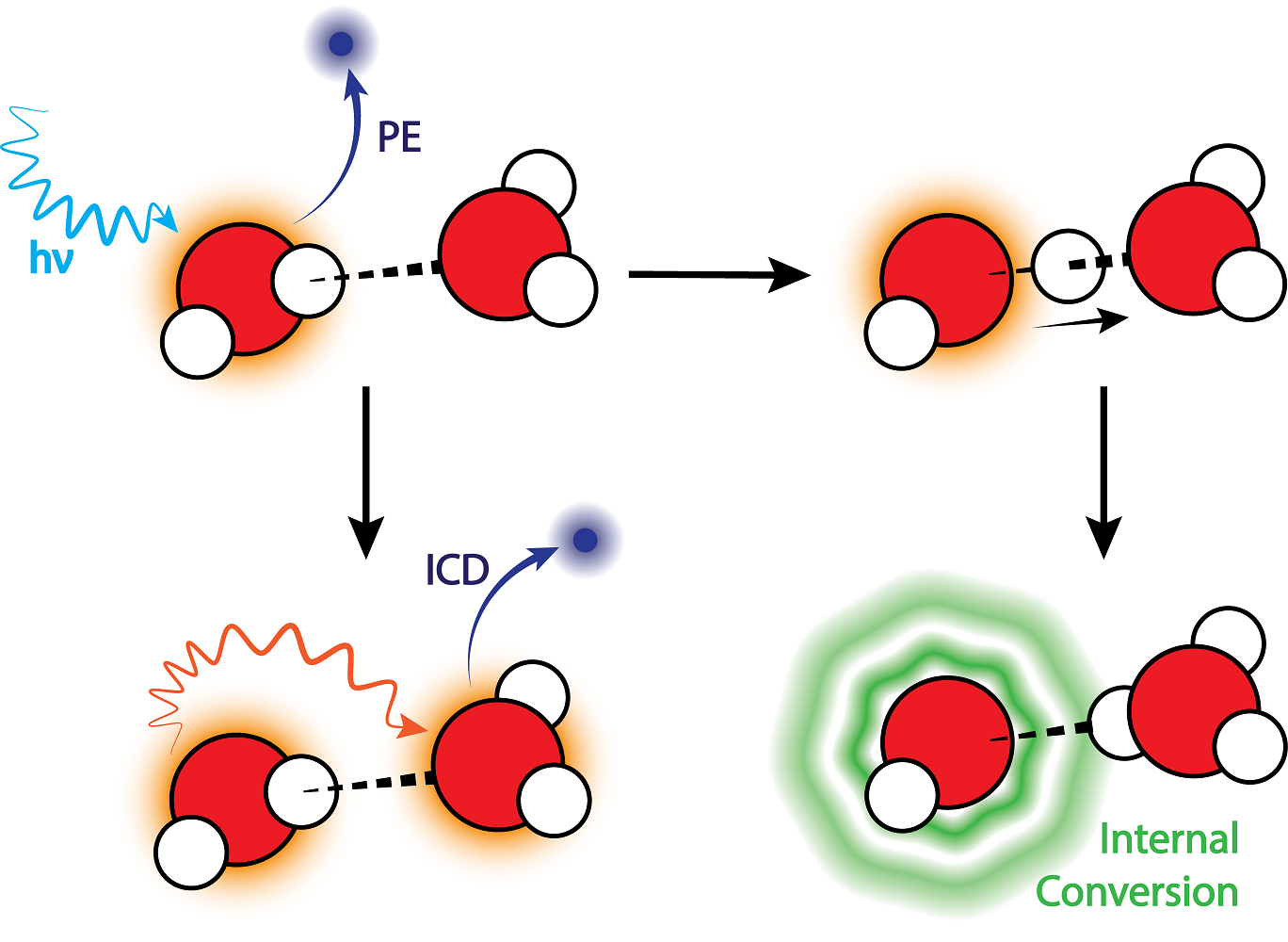 V čerstvé práci se vědci z Lipska, Prahy a Paříže zaměřili na otázku, co se děje po ozáření ve vodě v průběhu prvních několika femtosekund. Konkrétně je zajímal děj zvaný mezimolekulový coulombovský rozpad (ICD): vyražení elektronu z jedné molekuly vede následně k vypuzení elektronu z molekuly sousední. Tento jev byl ve vodě experimentálně pozorován teprve v roce 2010 a může hrát velkou roli, neboť při něm z molekul vyletují nebezpečné pomalé elektrony, poškozující molekuly DNA.
